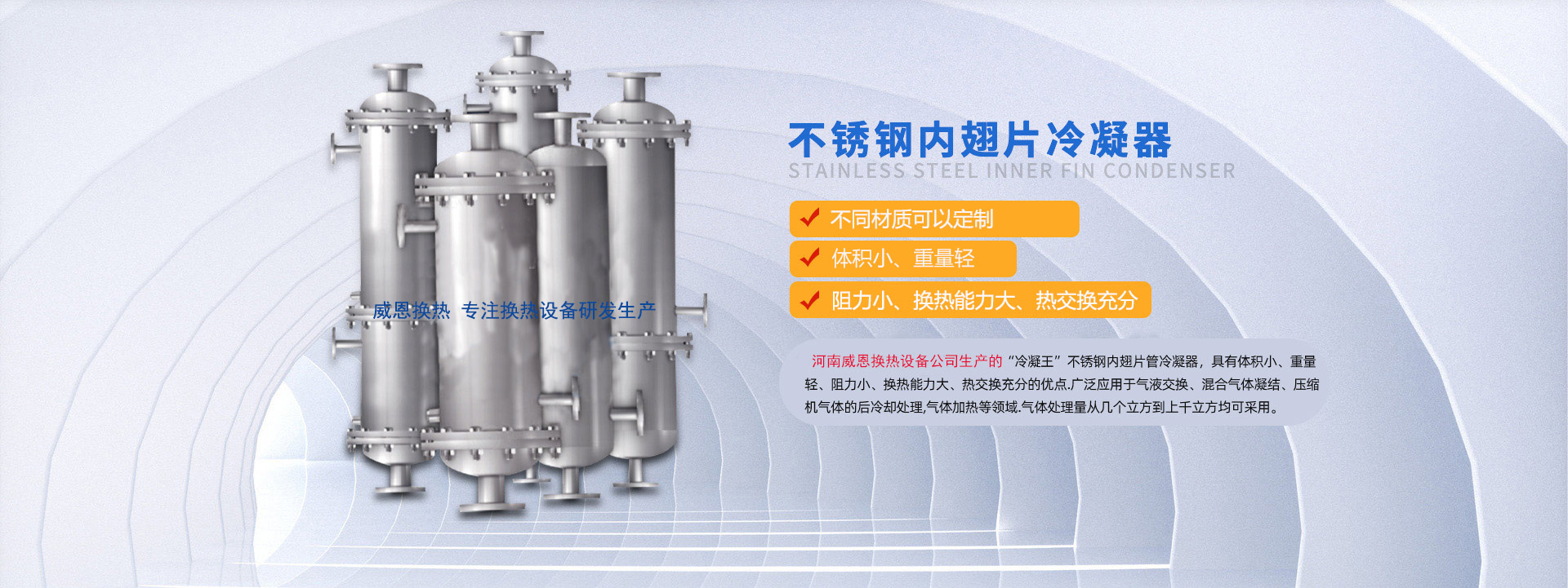 河南威恩換熱設(shè)備有限公司是一家專業(yè)生產(chǎn)制造螺旋板式換熱器、列管式換熱器、節(jié)能換熱設(shè)備的廠家,集科研、設(shè)計、生產(chǎn)、銷售、工程安裝、調(diào)試為一體的技術(shù)型企業(yè)。公司成立以來一直致力于節(jié)能環(huán)保換熱設(shè)備的研發(fā)生產(chǎn),主要產(chǎn)品包括螺旋板換熱器、列管式換熱器、內(nèi)翅片冷凝器以及鋼制儲罐、反應釜等的研發(fā)設(shè)計與銷售。公司研發(fā)生產(chǎn)的螺旋板式換熱器,傳熱效率高、可靠性高、阻力小、不易堵塞、可有效回收低品位熱能,已經(jīng)廣泛應用到化學、石油、溶劑、醫(yī)藥、食品、輕工、紡織、冶金、軋鋼、焦化等行業(yè),取得了良好的效果,得到顧客的廣泛認可和一致好評。針對制藥行業(yè),本公司生產(chǎn)的新型不銹鋼內(nèi)翅片換熱... 【了解更多】